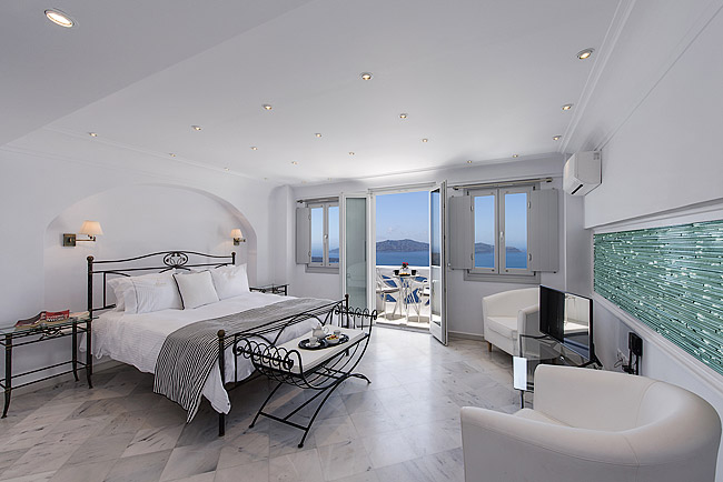 • Junior Cave Suite - Completamente privata e con una splendida vista sulla caldera, questa suite è ideale per le coppie ed offre un letto king size e tutti i comfort. Il balcone è privato.