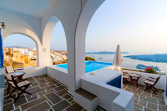 Tutte le suites, molto spaziose, vantano una splendida vista del profondo blu del mare Egeo e degli spettacolari tramonti di Santorini, donando relax e comfort quali: aria condizionata, TV satellitare, telefono, cassetta di sicurezza, frigo, accesso wireless ad internet, asciugacapelli, bagno con vasca o jacuzzi, balcone o terrazza privata. |