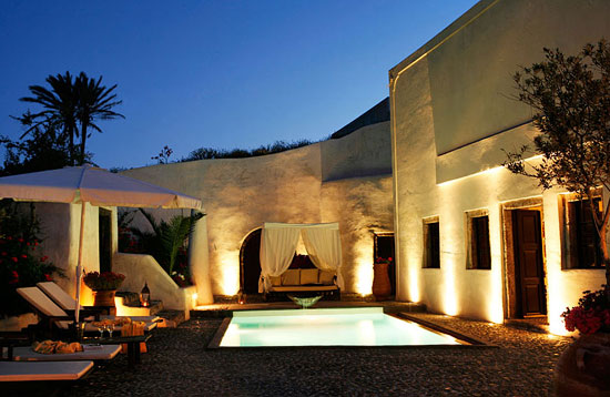 L'accesso alla casa avviene attraverso imponenti porte in legno che immettono in un appartato e grazioso cortile privato, con giardino e una bellissima piscina in stile marocchino. Nel piccolo cortile gli ospiti possono tranquillamente pranzare e cenare "all'aperto" sotto il cielo di Santorini, respirando l'atmosfera di un villaggio quasi a portata di mano.